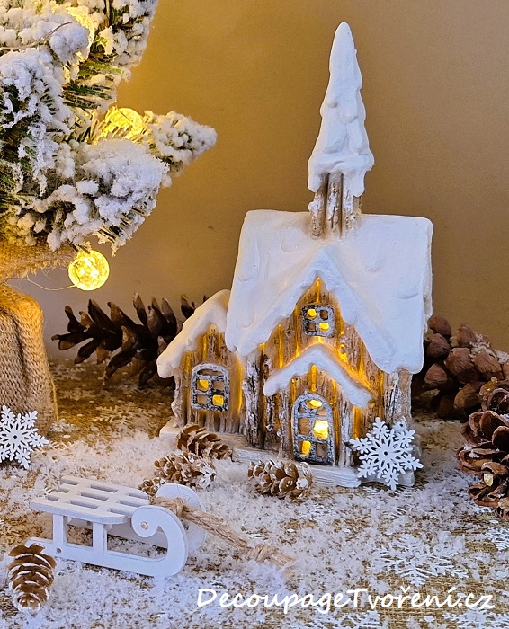 Zasněžený kostel s LED osvětlením jako ze zimní pohádky. Na střeše je velká vrstva sněhu, tak jak ji známe z horských samot, vysoko v horách. Inspirace a Photo By Lucie B., DecoupageTvoření.cz