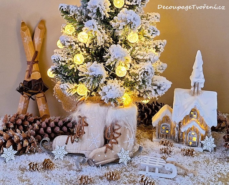 Báječnou zimní hygge pohodu si vytvořte doma. Ozdoby snadno pořídíte v e-shopu. Lyže a hudebníci pod stromečkem s LED světelným řetězem. Inspirace a Photo By Lucie B., DecoupageTvoření.cz
