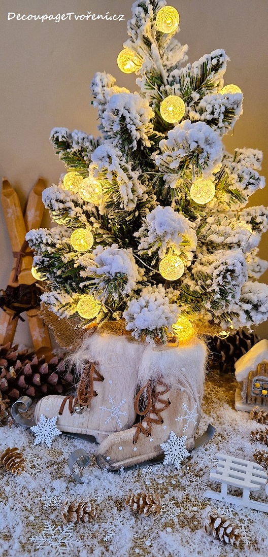 Nepotřebujete velký strom, abyste na něj zavěsili LED světýlka. Brusle a lyže, které máte připraveny na zimu, nemusíte použít jako ozdobu. Vločky nechytejte do dlaní, roztály by vám. Designéři tyhle praktické věci "zmenšily", a tak si vytvořte svoje malé zimní zátiší. Inspirace a Photo By Lucie B., DecoupageTvoření.cz
