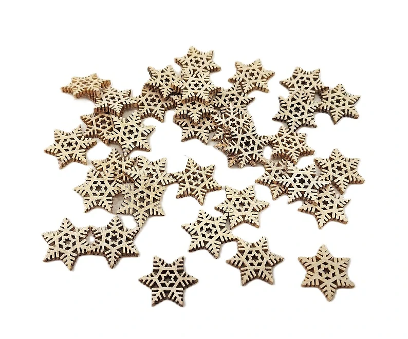 Malé sněhové vločky, výřez ze dřeva v přírodním odstínu, s miniaturním otvorem pro umístění provázku k zavěšení.