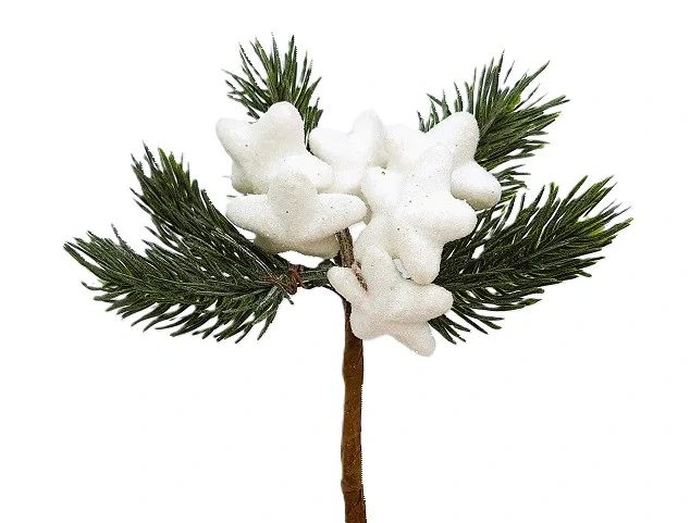 Smrková větvička s bílými hvězdami - plná jemné elegance do zimního aranžmá. Tyhle větvičky nikdy neopadnou, a tak si je užijte po celé zimní období.